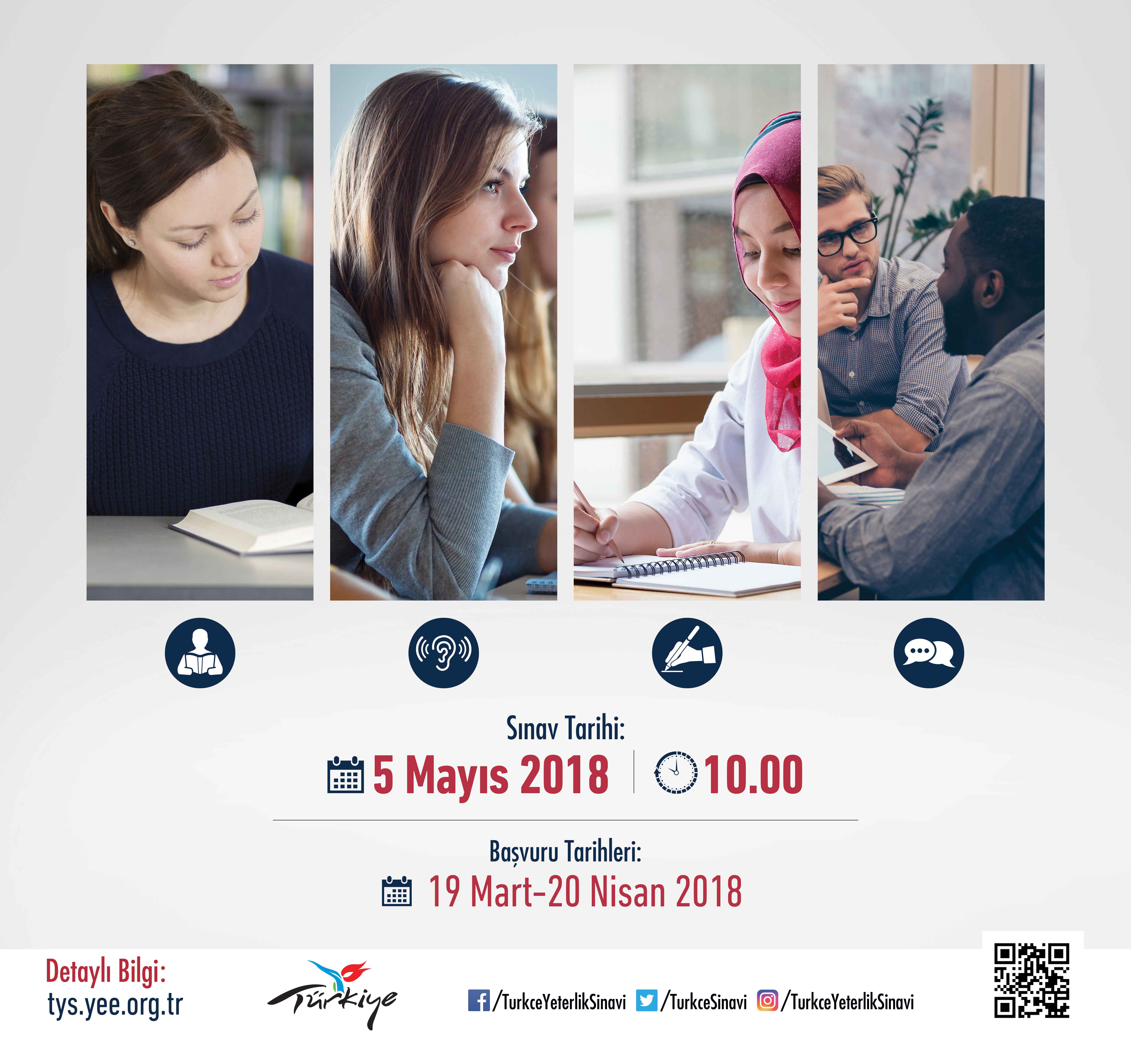5 Mayıs 2018 tarihinde yurt dışında Yunus Emre Türk Kültür Merkezlerinde ve Türkiye'de Ankara'da Türkçe Yeterlik Sınavı (TYS) yapılacaktır.