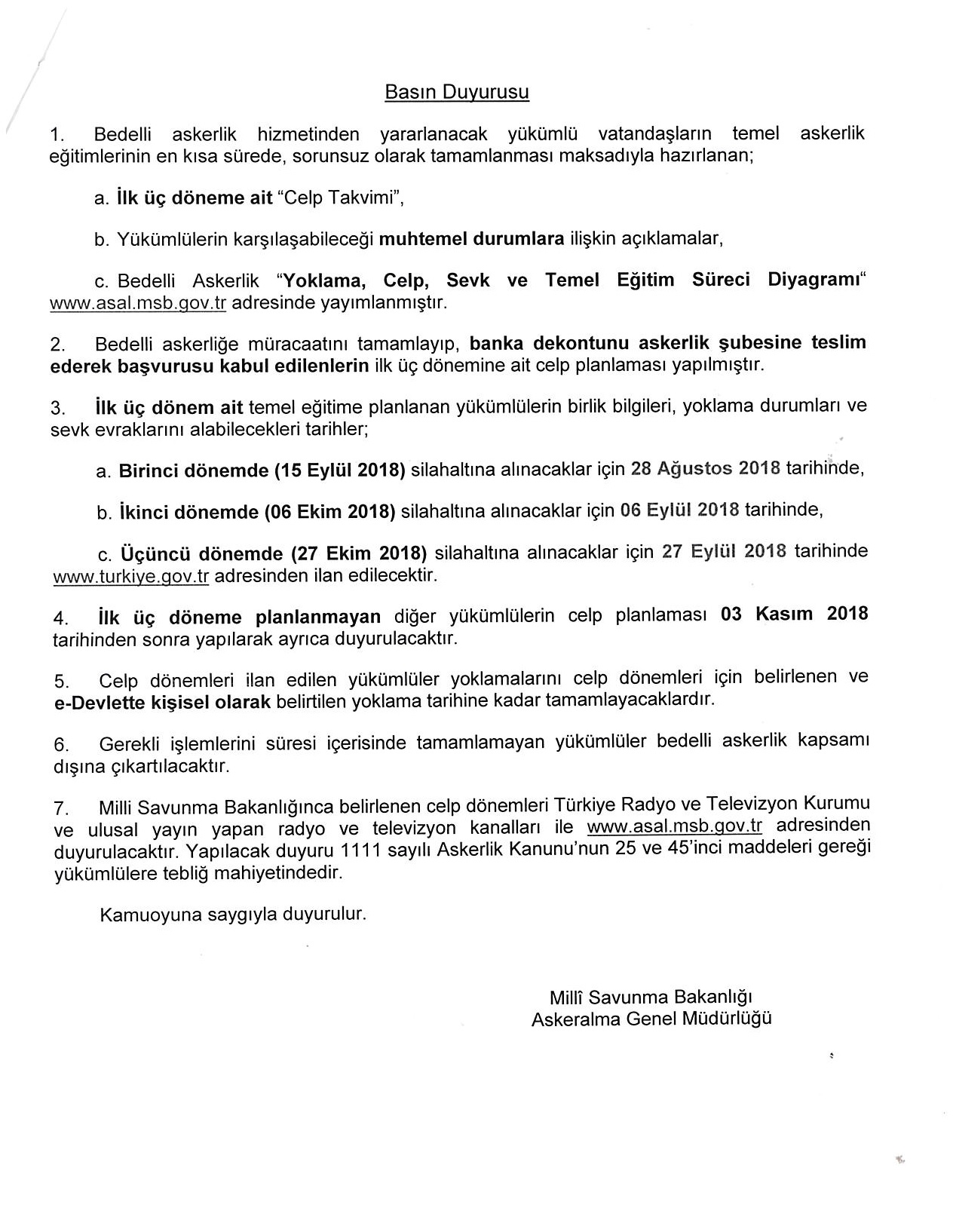 Milli Savunma Bakanlığımızın bedelli askerlik hizmeti celp ve sevk işlemlerine ilişkin duyurusuekte sunulmaktadır.
