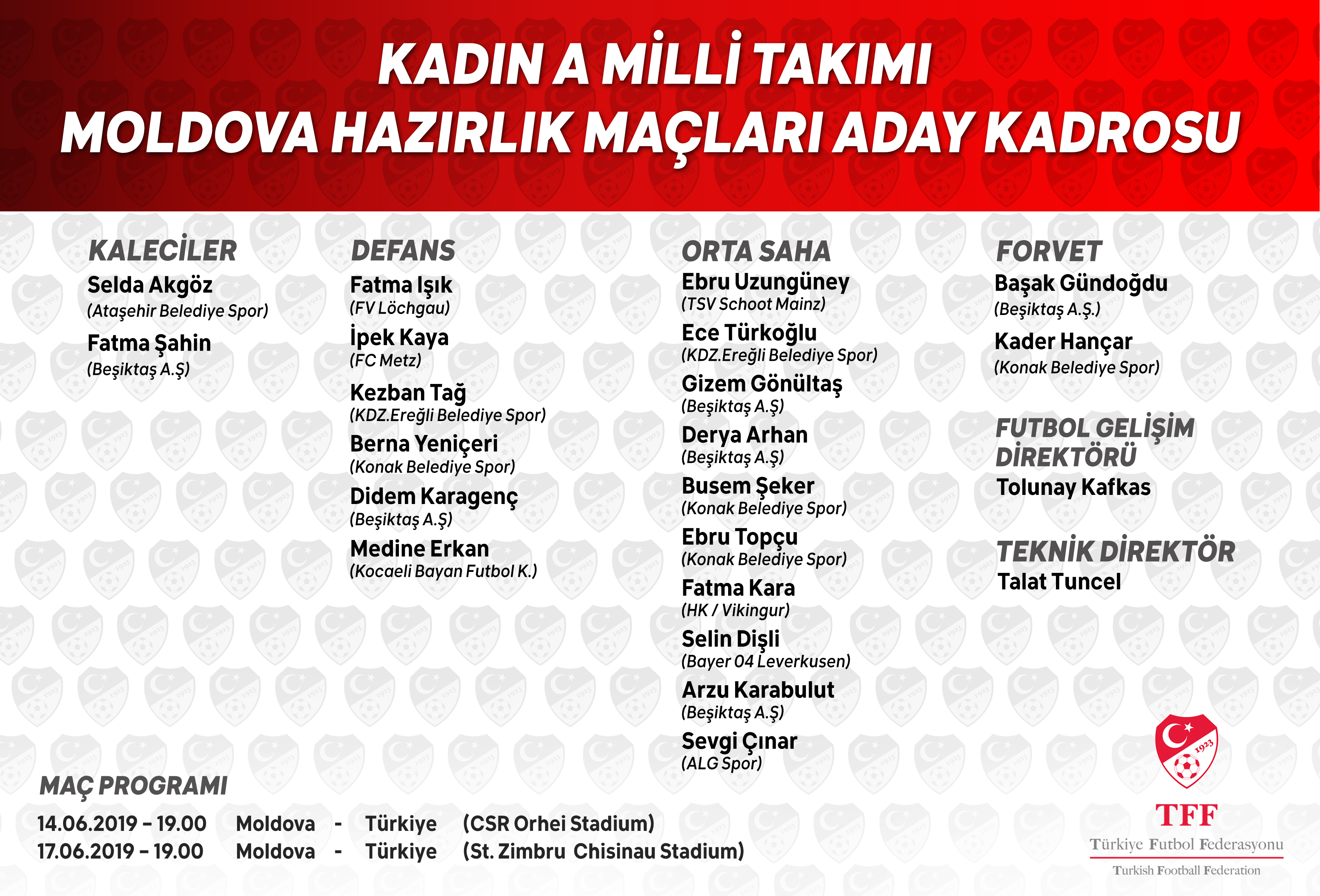 Kadın A Milli Takımımız 14-17 Haziran 2019 tarihlerinde Moldova'da hazırlık maçları oynayacaklardır.