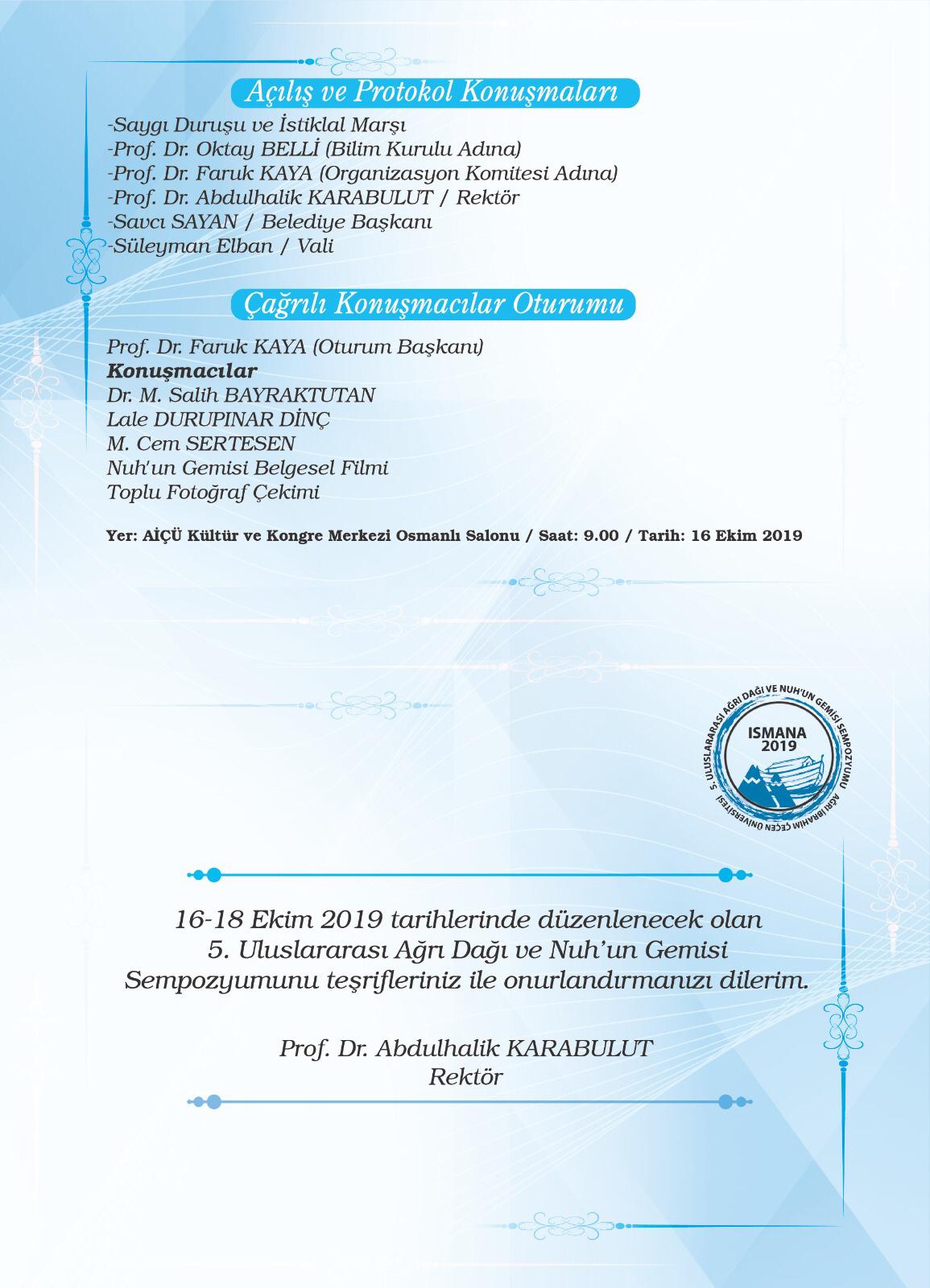 Ağrı İbrahim Çeçen Üniversitesi tarafından Üniversite'nin Kültür ve Kongre Merkezi'nde 16-18 Ekim 2019 tarihlerinde "5. Uluslararası Ağrı Dağı ve Nuh'un Gemisi Sempozyumu" düzenlenecektir.