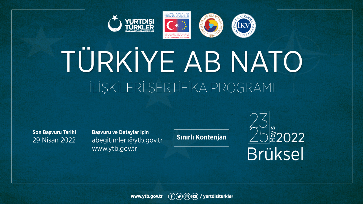 Yurtdışı Türkler ve Akraba Topluluklar Başkanlığı, Avrupa Birliği Başkanlığı, Türkiye Odalar ve Borsalar Birliği ve İktisadi Kalkınma Vakfı Brüksel Temsilciliği işbirliğiyle, yurtdışında ikamet eden ve bu ülkelerde hukuk, siyaset bilimi, uluslararası ilişkiler ve ilgili sosyal bilimler branşlarında eğitim alan gençlerimize, 23-25 Mayıs 2022 tarihlerinde Brüksel'de "TÜRKİYE-AB-NATO İlişkileri" sertifika programı düzenlenecektir.