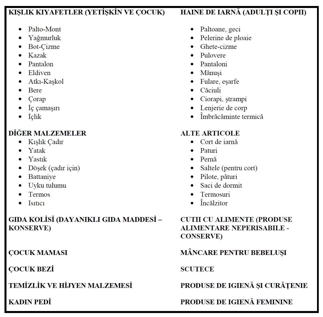 Este de dorit ca produsele să fie noi și să corespundă condițiilor de iarnă. Este important ca acestea să fie livrate la Ambasada Turciei într-o manieră ordonată, produsele fiind împachetate în cutii însoțite de lista conținutului.